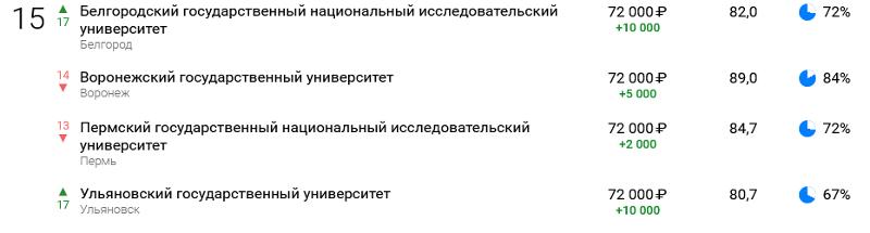 Воронежский государственный университет разделил 15-е место с Белгородским, Пермским и Ульяновским государственными университетами. Зарплата, на которую в Москве может претендовать специалист в первые пять лет после окончания ВГУ, составляет в среднем 72 000 руб., за год прирост зарплат составил 5000 руб.