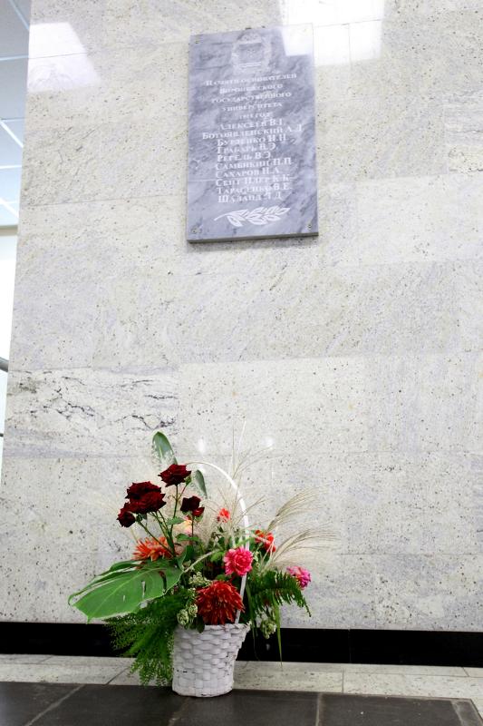 Ректор рассказал о многолетней истории вуза – корпусах, заповеднике Галичья гора и Ботаническом саде ВГУ, сотрудники которого передали в честь праздника цветы для мемориальной доски, посвященной основателям вуза.