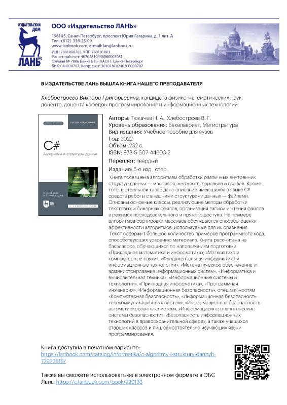 Издательство «Лань» выпустило ещё одну книгу по языку C# авторства доцента кафедры программирования и информационных технологий Виктора Хлебостроева. На этот раз — об алгоритмах и структурах данных.
