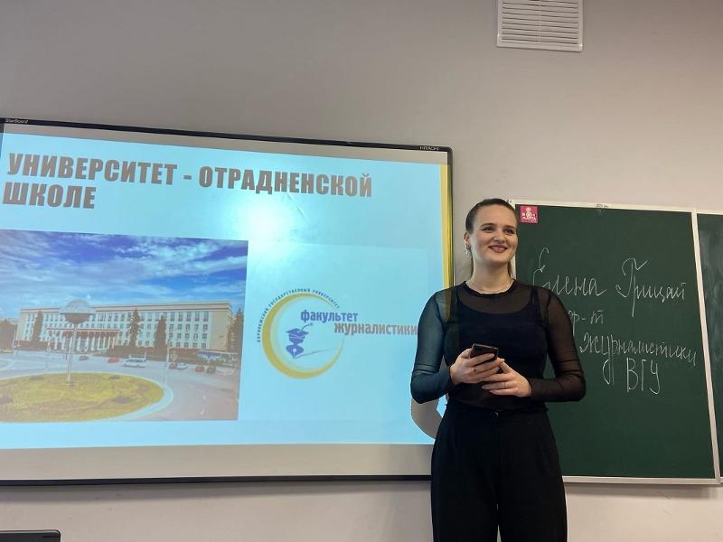 27 октября в Отрадненской школе прошла очередная встреча в рамках проекта «Университет – Отрадненской школе». На этот раз школьники встретились со студенткой факультета журналистики ВГУ, интернет-маркетологом Еленой Грицай.