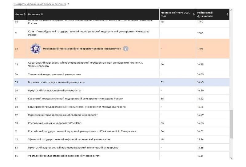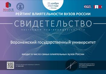 Рейтинговое агентство RAEX опубликовало список самых влиятельных российских вузов по версии «РАЭКС-Аналитики». По итогам рейтинга влиятельности вузов России в 2022 году Воронежский государственный университет занял 55-е место. Предыдущий рейтинг был опубликован в 2020 году.