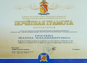 Сотрудников филологического факультета ВГУ наградили почётными грамотами от ГУ МВД по Воронежской области. Награды от генерала-лейтенанта Михаила Бородина получили декан факультета Жанна Грачёва и доцент кафедры русского языка Ольга Швецова.