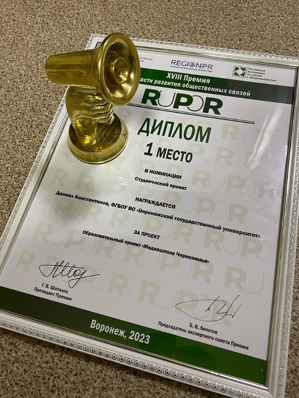 27–28 января в Воронеже состоялся финал премии в области развития общественных связей «RuPoR». Результаты были объявлены на PR-форуме «Дни PR в ЦФО». Победителем в номинации «Студенческий проект» признан студент факультета журналистики ВГУ, руководитель Образовательного проекта «Медиашкола Черноземья» Даниил Константинов.