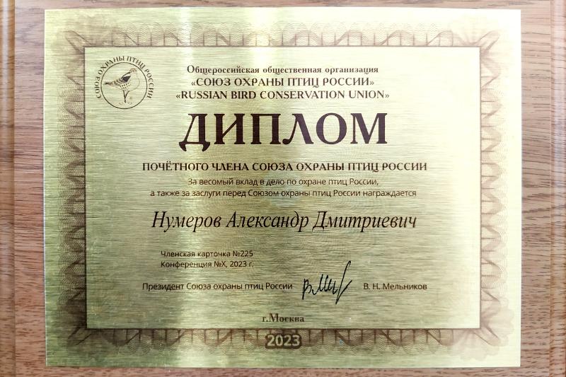 Профессора Александра Нумерова наградили дипломом за весомый вклад в дело по охране птиц России и за заслуги перед Союзом охраны птиц России. Также ему передали диплом на имя Леонида Леонидовича Семаго (1928–2008) – известного писателя-натуралиста, педагога, почётного гражданина Воронежа, долгие годы работавшего доцентом кафедры зоологии позвоночных (сегодня – кафедра зоологии и паразитологии) ВГУ.