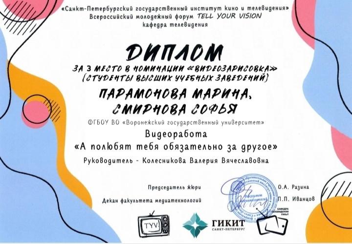 Второкурсницы факультета журналистики (направление «Телевидение») Марина Парамонова и Софья Смирнова стали лауреатами Всероссийского конкурса видеоработ «Культура на экране». Конкурс проводил Санкт-Петербургский государственный институт кино и телевидения в рамках Всероссийского молодёжного форума Tell Your Vision.