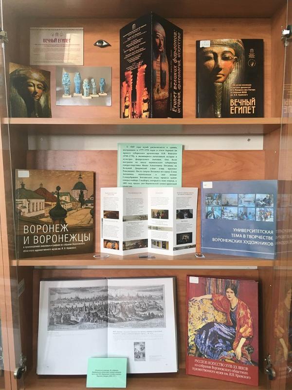 Примечательно, что на выставке представлены два издания, одно из которых хранится в отделе обслуживания юридического факультета ВГУ (Сводный каталог культурных ценностей, похищенных и утраченных в период Второй мировой войны / Т. 10: Воронежский областной художественный музей им. И.Н. Крамского, 2003), другое – в отделе обслуживания гуманитарных факультетов (Дерпт – Юрьев – Тарту и Воронеж: история университетской коллекции: каталог 1, 2006). Также указана информация о двух изданиях, которые хранятся в отделе редких книг из владельческой библиотеки Олега Ласунского (Садретдинова А.А. Музей для детей: 6+. – Воронеж: Воронежский областной художественный музей им. И.Н. Крамского, 2016; Иллюстрация как верность стилю: выставка книжной графики В.А. Милашевского из фондов Воронежского областного художественного музея им. И.Н. Крамского: к 120-летию со дня рождения В.А. Милашевского: каталог выставки; Воронеж. обл. художественный музей им. И.Н. Крамского; – Воронеж: Кварта, 2013).