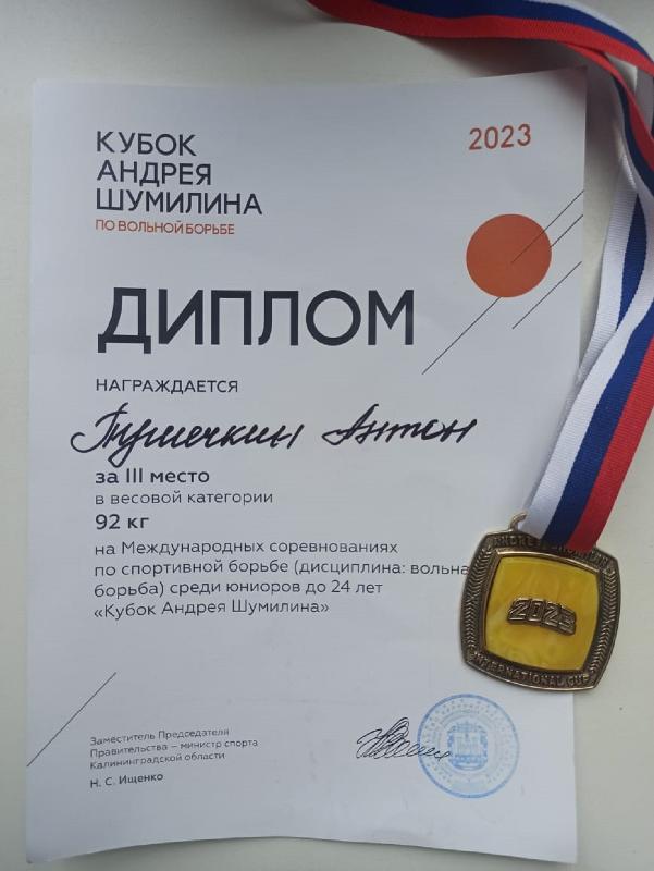 10 марта в Калининграде состоялся 26-ой международный турнир «Кубок Андрея Шумилина» по вольной борьбе. Студент второго курса математического факультета ВГУ Антон Пушечкин занял третье место в весовой категории до 92 кг. Тренер спортсмена – заведующий кафедрой физического воспитания и спорта ВГУ, мастер спорта СССР Александр Беланов.