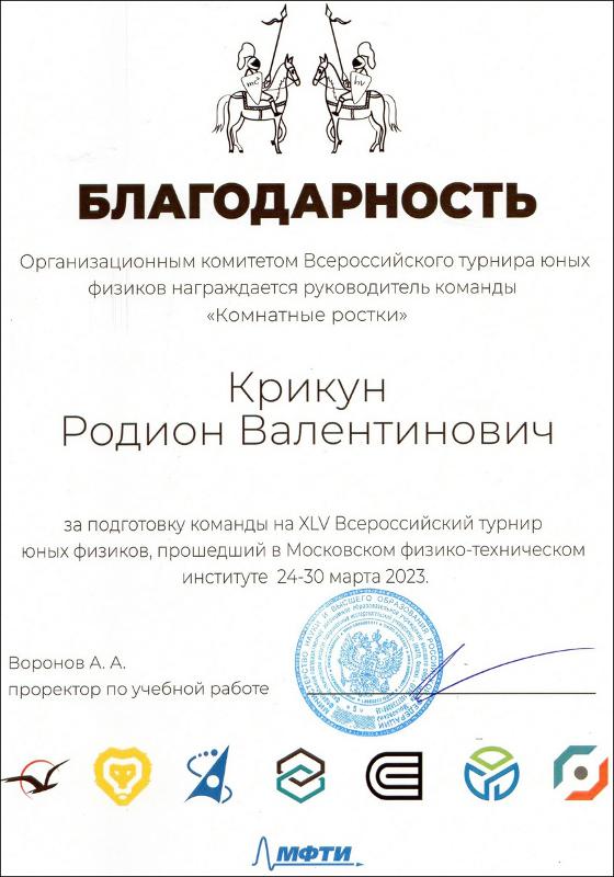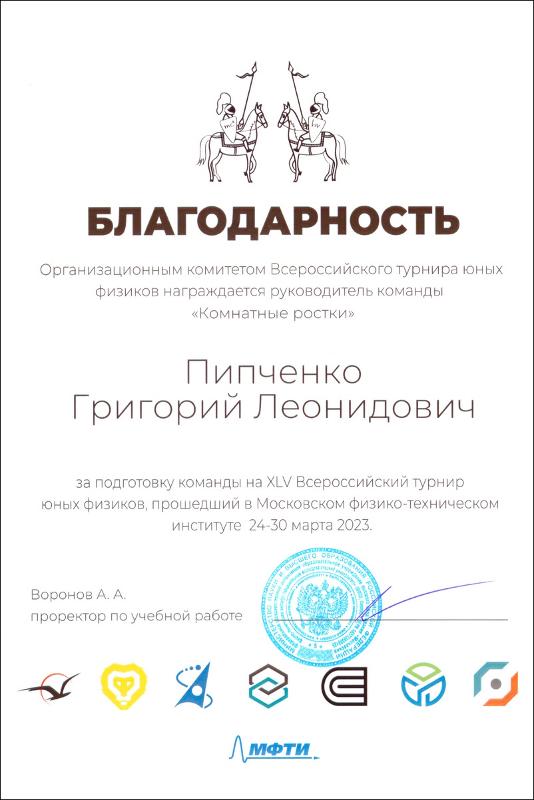 С 24 по 30 марта на базе МФТИ (Долгопрудный) прошёл XLV Всероссийский турнир юных физиков (ТЮФ). В турнире приняла участие команда воронежских школьников «Комнатные ростки», подготовленная на базе ДТ «Кванториум» под руководством выпускника физического факультета, педагога ДТ «Кванториума» Ростислава Комнатного, первокурсника физического факультета Григорий Пипченко и первокурсника факультета компьютерных наук Родиона Крикуна.