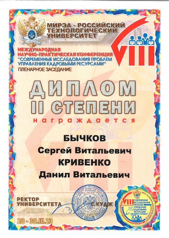 Второкурсники экономического факультета Сергей Бычков и Данил Кривенко получили диплом второй степени по итогам Международной научно-практической конференции «Современные исследования проблем управления кадровыми ресурсами». Конференцию организовали представители МИРЭА – Российского технологического университета (Москва). В ней приняли участие делегаты 28 российских и зарубежных вузов.