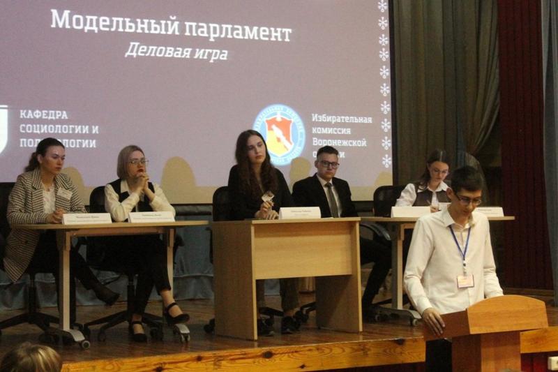 21 апреля студенты третьего курса исторического факультета ВГУ (направление «Политология») совместно с Молодёжной Избирательной комиссией организовали деловую игру «Модельный парламент». Мероприятие состоялось на базе Гимназии имени Андрея Платонова.