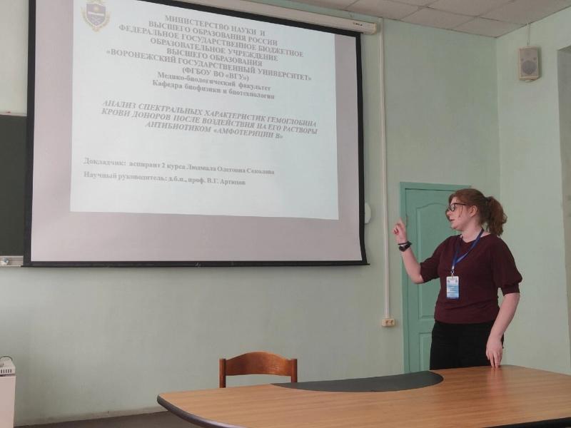 Доцент Сергей Антипов представил доклад на тему «Многофункциональный ферритинподобный белок Dps может взаимодействовать с фосфолипидными везикулами и интегрироваться в мембраны E.coli». Научные сотрудники – Мария Лавлинская и Андрей Сорокин – представили стендовые доклады, а Людмила Соколова выступила с докладом на тему «Анализ спектральных характеристик гемоглобина крови доноров после воздействия на его растворы антибиотиком «Амфотерицин В».