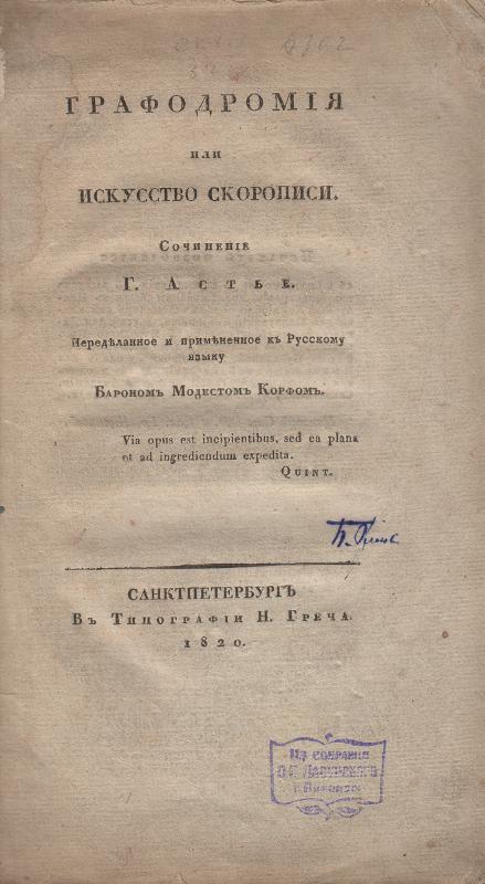 Прозвучал доклад об учебном пособии по скорописи, которое было подготовлено бароном Модестом Корфом (1800–1876), сокурсником А.С. Пушкина по Царскосельскому лицею. Это книга «Графодромия, или Искусство скорописи» (Санкт-Петербург, 1820). Будучи переводчиком в министерстве юстиции и наблюдая за работой писцов в канцелярии, Корф пришёл к мысли, что её можно оптимизировать, обратился к книге Ф.И. Астье, посвящённой стенографии, и творчески переработал его систему применительно к русскому языку. Книга была издана по подписке. В списке подписчиков – имена Александра Грибоедова, Вильгельма Кюхельбекера, Петра Плетнёва и двух представителей семейства Пушкиных. Это Сергей Львович и Александр Сергеевич Пушкины, отец и сын.