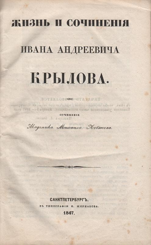 Был представлен также труд академика М.Е. Лобанова о жизни и сочинениях Ивана Андреевича Крылова (Петербург, 1847) с дарственной надписью вдовы автора Я.И. Ростовцеву (1847). Михаил Евстафьевич Лобанов (1787–1846) – автор первой книги об И.А. Крылове – российский поэт и переводчик, в труде о баснописце впервые приводит некоторые его ранние опыты в драматическом жанре и разнообразные бытовые подробности.