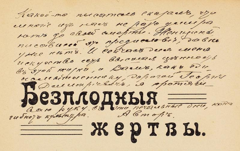 Прозвучал рассказ об экземпляре пьесы А.А. Вербицкой «Бесплодные жертвы» (Москва, 1906). В начале XX века Анастасия Алексеевна Вербицкая (1861–1928), уроженка Воронежа, была известной писательницей, её произведения пользовались невероятным успехом. По масштабам читательской аудитории она опережала даже Льва Толстого. В библиотеках книги Вербицкой были нарасхват и переиздавались большими тиражами. Наш экземпляр примечателен тем, что имеет дарственную надпись автора.