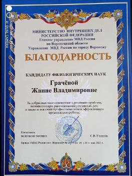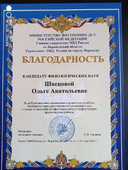Благодарность объявлена декану факультета Жанне Грачёвой, профессору кафедры русского языка Людмиле Кольцовой и доценту кафедры русского языка Ольге Швецовой. «За добросовестное отношение к решению проблем, возникших при расследовании уголовных дел, а также за высокий профессионализм и эффективную организацию работы», – звучит формулировка благодарности.