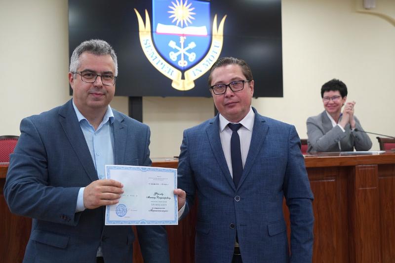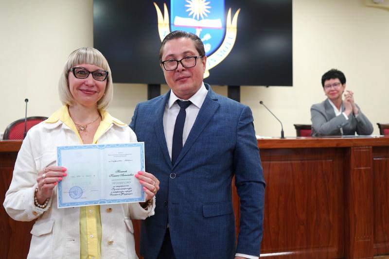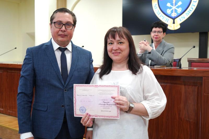 В торжественной обстановке аттестаты профессоров были вручены преподавателям университета Михаилу Фролову, Алексею Ковалеву и Ксении Нагиной. Диплом доктора филологических наук был вручён Александре Рудаковой.