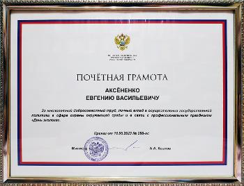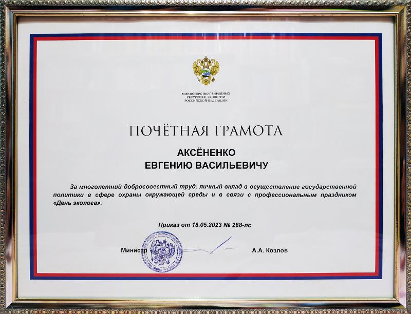 Представитель ВГУ Евгений Аксёненко получил почётную грамоту Министерства природных ресурсов и экологии Российской Федерации за многолетний добросовестный труд, личный вклад в осуществление государственной политики в сфере охраны окружающей среды.