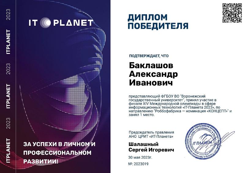 Студенты факультета прикладной математики, информатики и механики ВГУ Елизавета Колганова (2 курс), Михаил Омельченко (2 курс), Данил Пупыкин (1 курс) и Александр Баклашов (1 курс магистратуры) приняли участие в Международной олимпиаде в сфере информационных технологий «IT-Планета 2023». Команда студентов факультета ПММ стала победительницей олимпиады, заняв 1-е место.