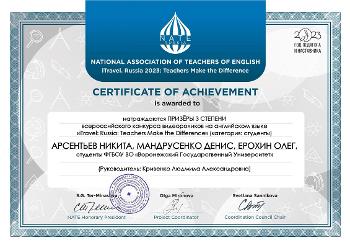 Студенты 2 курса факультета ПММ Никита Арсентьев, Денис Мандрусенко и Олег Ерохин заняли 3-е место во Всероссийском конкурсе видеороликов на английском языке «iTravel.Russia. Teachers Make the Difference».