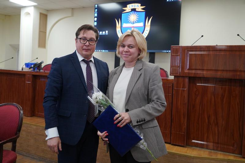 В начале заседания Дмитрий Ендовицкий вручил почётный диплом имени В.Д. Добромирова «За верность традициям реалистического искусства» директору художественного музея им. И.Н. Крамского Юлии Зайченко. Он отметил её работу по реализации системного проекта поощрения студентов художественных факультетов по итогам 2022/2023 учебного года, учреждённого Советом ректоров вузов Воронежской области.