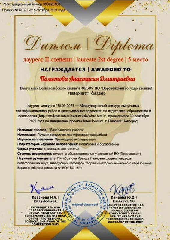 В настоящее время Анастасия – магистрантка и преподаватель Борисоглебского филиала ВГУ. Руководителя работы, кандидата педагогических наук Ирину Пятибратову также отметили дипломом 2-ой степени как победителя Международного конкурса руководителей научно-исследовательских проектов.