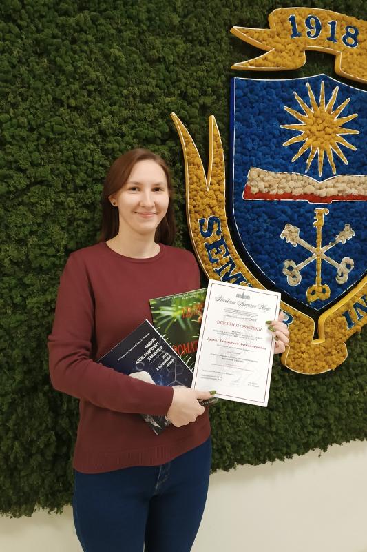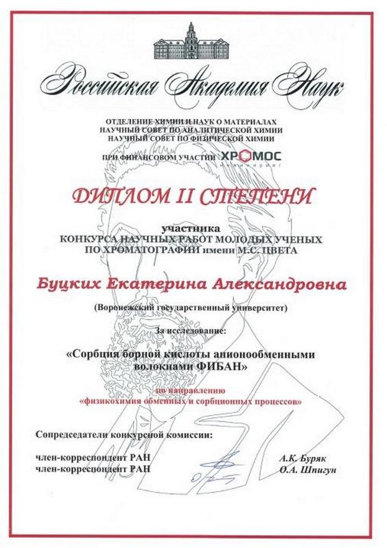 Дипломом II степени отметили работу магистранта Екатерины Буцких «Сорбция борной кислоты анионообменными волокнами ФИБАН». Исследование выполнялось под руководством кандидата химических наук, доцента кафедры аналитической химии Ираиды Воронюк.