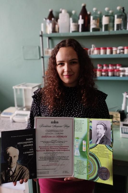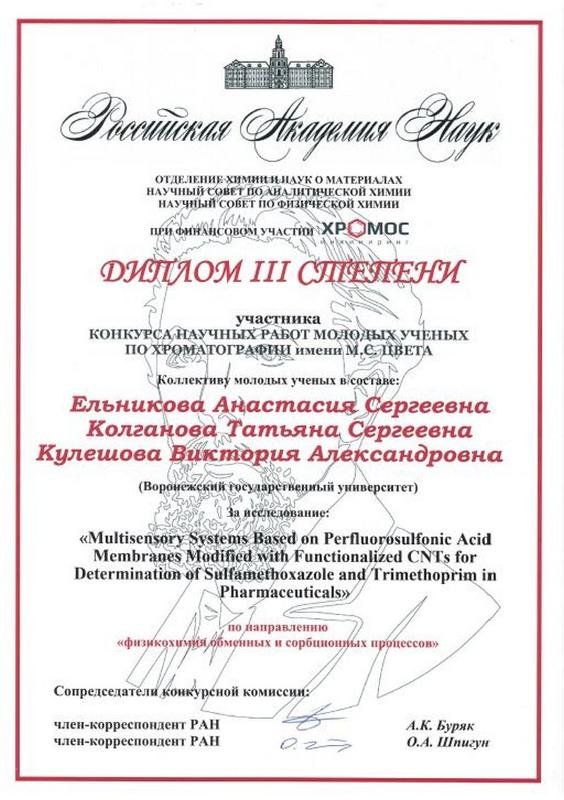 Коллектив авторов: аспирант Анастасия Ельникова, кандидат химических наук, старший научный сотрудник в области химии Татьяна Колганова, магистрант Виктория Кулешова удостоены диплома III степени за работу «Multisensory systems based on perfluorosulfonic acid membranes modified with functionalized CNTs for determination of sulfamethoxazole and trimethoprim in pharmaceuticals», выполненную под руководством доктора химических наук, доцента кафедры аналитической химии Анны Паршиной.