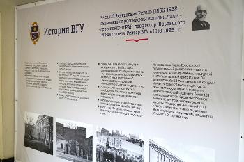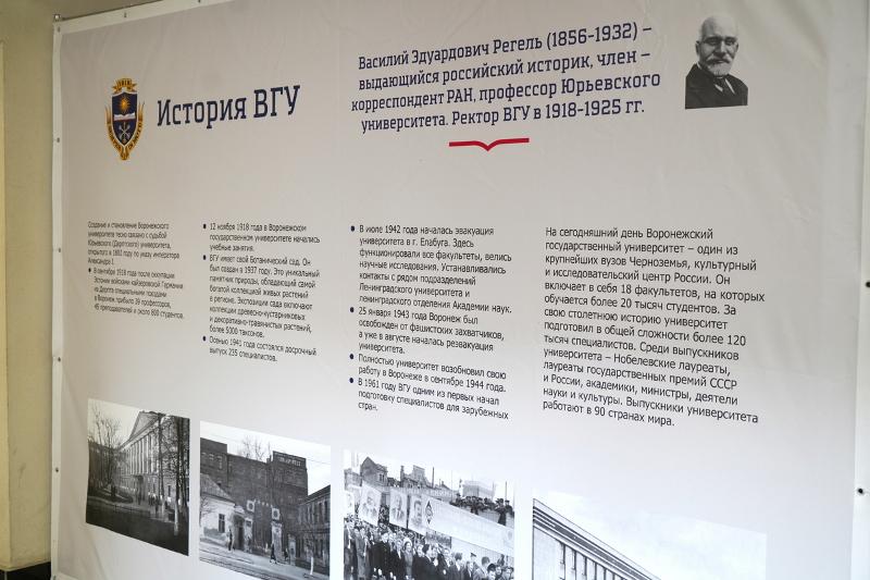 К 105-летию Воронежского государственного университета в холле первого этажа главного учебного корпуса ВГУ была размещена выставка с разделами экспозиции: «От Императорского Дерптского до Воронежского государственного», «Трудное становление», «Уверенный взлёт». Сотрудники Музейно-выставочного центра ВГУ рассказали о становлении Воронежского университета. Для выставки были подобраны подлинные экспонаты, хранящиеся в музее истории ВГУ: «волшебный фонарь» – аппарат для проекции изображений (1927 года), патефон – механическое устройство для проигрывания граммофонных пластинок, переносная версия граммофона, подлинные фотографии.