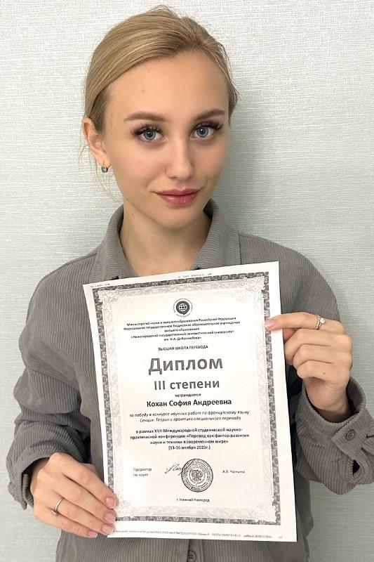 София Кохан, студентка 4 курса специальности «Перевод и переводоведение» заняла третье место в номинации «Теория и практика специального перевода» с докладом на тему «Синестетические сочетания в тексте оригинала и перевода (французский язык)»: