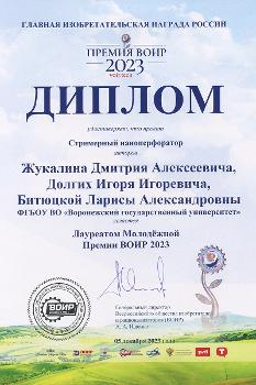 5 декабря на площадке Московской Торгово-промышленной палаты состоялось торжественное награждение победителей Премии Всероссийского общества изобретателей и рационализаторов «ВОИР 2023». Одним из победителей стал доцент кафедры физики полупроводников и микроэлектроники ВГУ Дмитрий Жукалин.