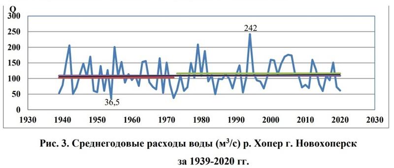 За основу анализа Ярослав взял данные гидропоста реки Хопер в городе Новохоперске о расходах воды за 1939–2020 годы. Для графического представления стоковых характеристик во времени были использованы средние годовые и минимальные расходы за два периода межени (зимний и летний), а также максимальные расходы воды за период 1939 –2020 годов. По указанным данным был построен график среднегодовых расходов воды реки Хопер в городе Новохоперске.