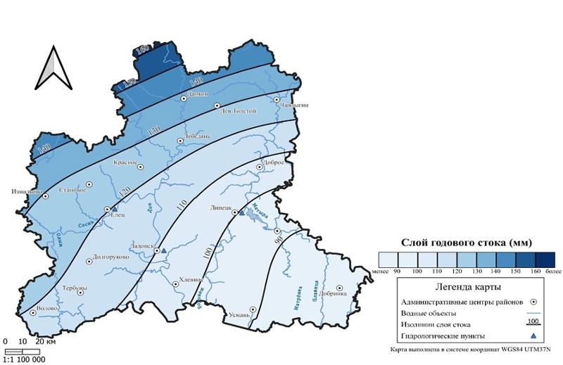 Полученные данные о диапазоне изменений слоя стока по территории Липецкой области позволили исследователю составить картосхему и провести изолинии со значениями 160–90 мм. Моделирование водосборов произведено Даниилом Дюкаревым на основе цифровой модели рельефа MERIT DEM. Карта слоя годового стока легла в основу определения водности муниципальных районов Липецкой области и последующей оценки удельной водообеспеченности региона.