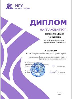 Диана Шовгарян стала призёром сразу в двух номинациях: с французским языком – 3-е место в номинации «Перевод научно-популярного текста с французского языка на русский язык» и с английским языком – 3-е третье место в номинации «Перевод научно-популярного текста с английского языка на русский язык»: