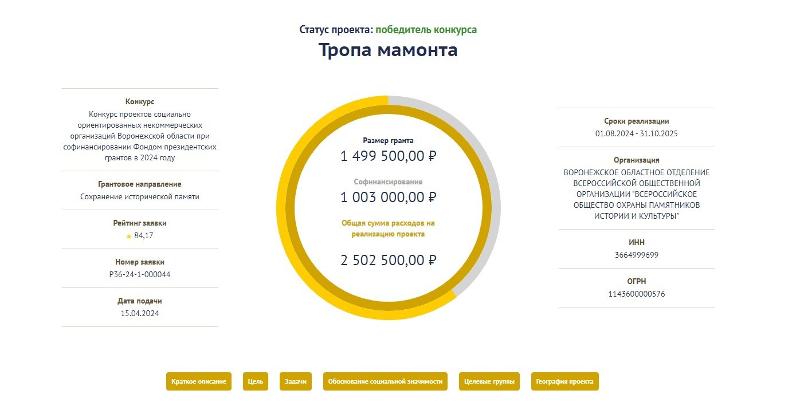 Автономная некоммерческая организация «Образ будущего» подвела итоги конкурса социально ориентированных некоммерческих организаций при софинансировании Фонда президентских грантов. В число победителей вошёл проект «Тропа мамонта», представленный на конкурс Воронежским областным отделением ВООПИК. Автор и руководитель проекта – магистрант 2-го курса направления «Политология» исторического факультета ВГУ Андрей Шушлебин.