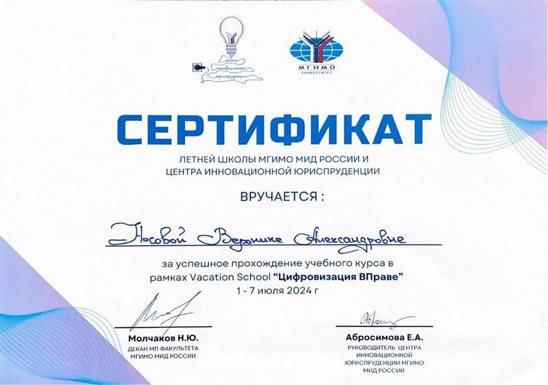 Студентка магистратуры юридического факультета ВГУ Вероника Носова с 1 по 7 июля успешно прошла обучение по основам цифровизации в праве в Летней Школе МГИМО Vacation School. Летняя школа организована Центром инновационной юриспруденции МГИМО МИД России.
