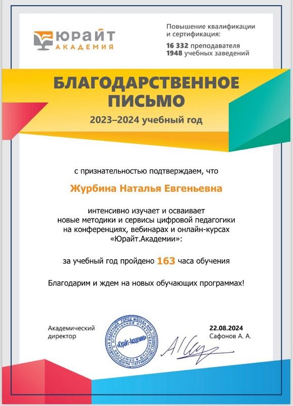 На основании цифровых данных 2023/24 учебного года, в течение которого было пройдено 163 часа обучения, руководство «Юрайт. Академии» приняло решение наградить Наталью Журбину именной благодарностью за интенсивное изучение и освоение новых методик и сервисов цифровой педагогики на конференциях, вебинарах и онлайн-курсах.