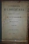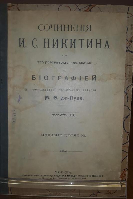Вниманию посетителей выставки предлагаются «Сочинения» И.С. Никитина с его портретом, fac-simile и биографией, составленной редактором издания Михаилом Фёдоровичем Де-Пуле. Де-Пуле – литературный критик, публицист и педагог, один из ближайших друзей поэта Ивана Никитина. Именно Де-Пуле стал хронологически первым биографом Ивана Саввича. В издание вошли стихотворения Никитина 1849–1861 годов, а также большие произведения: «Кулак» (в авторском издании), «Поездка на хутор», «Тарас», «Дневник семинариста».