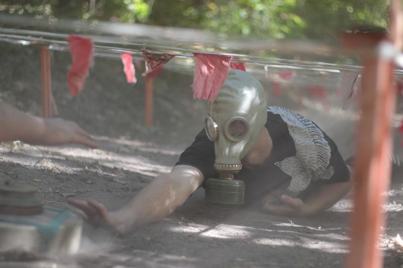Первым из них была полоса препятствий. Студенты взбирались на стену из шин, выполняли нормативы по берпи, ходили по бревну, пытаясь держать равновесие. Юноши также переносили ящики с боеприпасами. Часть маршрута участники бежали кросс, часть – ползли «по-пластунски» под натянутыми лентами. Одним из заданий полосы препятствий была переноска «раненого» на плащ-палатке. Студентам было необходимо не просто донести товарища до нужного места, но и сохранить его правильное расположение на носилках. В конце полосы препятствий один из участников каждой команды должен был установить противотанковую мину У-ТМ-62М и ползком добраться до финиша.