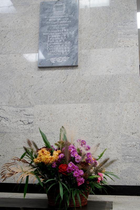 Сегодня в Главном корпусе ВГУ состоялось традиционное возложение цветов к мемориальной доске, посвящённой основателям университета. Так в ВГУ отметили 106-летие со дня начала первых занятий. Торжественное мероприятие открыла начальник управления по работе с молодёжью Екатерина Петровна Цебекова.