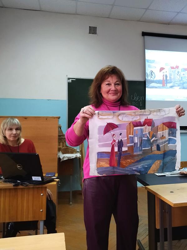 Студенты познакомились с произведениями Ирины Владимировны: сериями «полевые цветы», «натюрморты», «готика», «городские пейзажи», «Воронеж». Ирина Владимировна показала ребятам платки в технике батик, подарила открытки с изображением своих работ.