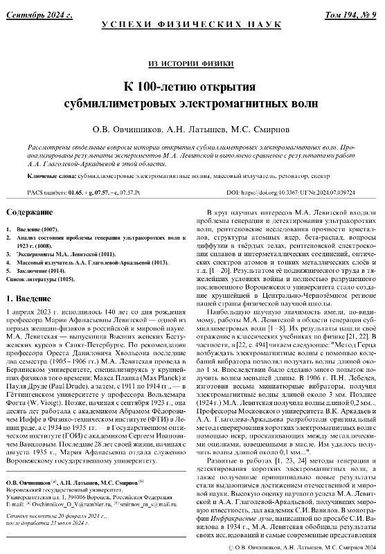 В престижном научном журнале «Успехи физических наук» опубликована статья, посвящённая 100-летию открытия субмиллиметровых волн и 140-летию со дня рождения Марии Афанасьевны Левитской – профессора Воронежского государственного университета. Материал подготовлен сотрудниками кафедры оптики и спектроскопии ВГУ: заслуженным деятелем науки РФ, профессором Анатолием Николаевичем Латышевым, профессором Олегом Владимировичем Овчинниковым и профессором Михаилом Сергеевичем Смирновым. Статья вышла в рубрике «Из истории физики».