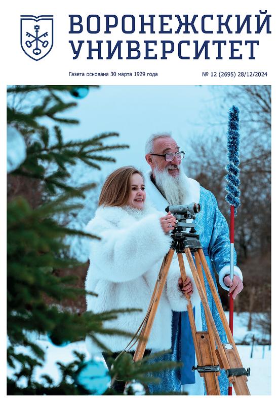 Новогодний выпуск газеты «Воронежский университет» уже доступен для читателей! На обложке праздничного номера – Сергей Владимирович Федотов, заведующий кафедрой рекреационной географии, страноведения и туризма, и выпускница факультета ГГиТ Евгения Широкова в образах Деда Мороза и Снегурочки.