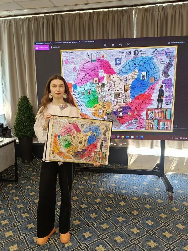 Для участия в конкурсе Анастасия представила карту-иллюстрацию «Страна русской литературы» – уникальный визуальный проект, отражающий значимые вехи русской доклассической, классической и новой классической литературы. Разработка карты велась больше полугода и потребовала изучения правил картографии, азов вёрстки и цветового режима, подбора шрифтов, приготовления макета широкоформатной печати для иллюстрации. Параллельно велась работа по отбору литературоведческого наполнения карты. Выбор её формыбыл определен символикой сердца, отсылающей к девизу филологического факультета «От сердца к сердцу».В результате получилось многослойное и глубокое произведение, которое не только эстетически привлекательно, но и позволяет передать на визуальном языке богатство и разнообразие русской литературы, динамику её развития.