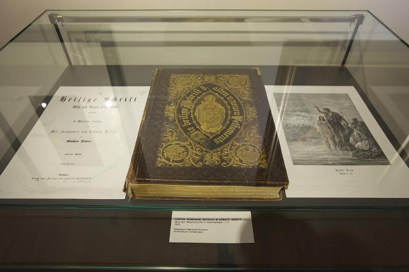 Куратор выставки, хранитель музейных предметов Юрий Сергеевич Малик в своем выступлении уделил особое внимание университетскому экземпляру книги, переданной в рамках выставки. Это нарядное, богато иллюстрированное издание большого формата в цельнокожаном переплете эпохи с золотым тиснением по корешку и крышкам переплета, а также с золотым обрезом. Перевод Священного Писания на немецкий язык сделан протестантским реформатором Мартином Лютером (1483–1546) и проиллюстрирован французским графиком Гюставом Доре (1832–1883), автором самых известных иллюстраций к «Библии». В «Новом завете» – 78 рисунков большого альбомного формата с широкими полями; внимание художника сосредоточено на персонажах, которые Доре старался создавать, не нарушая иконографического канона.