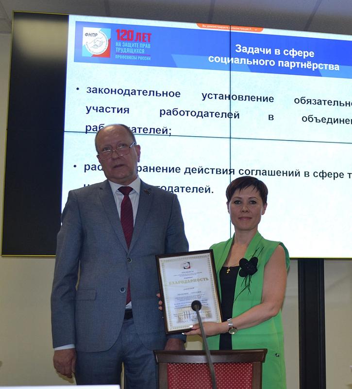 В рамках пленарного выступления Андрей Анатольевич Симонов от имени председателя Воронежского областного совета профсоюзов Евгения Леонидовича Проняева вручил Благодарность за конструктивное сотрудничество по развитию социально-трудовых отношений в Воронежской области заведующей кафедрой экономики труда и основ управления ВГУ, доктору экономических наук, доценту Екатерине Сергеевне Дашковой.