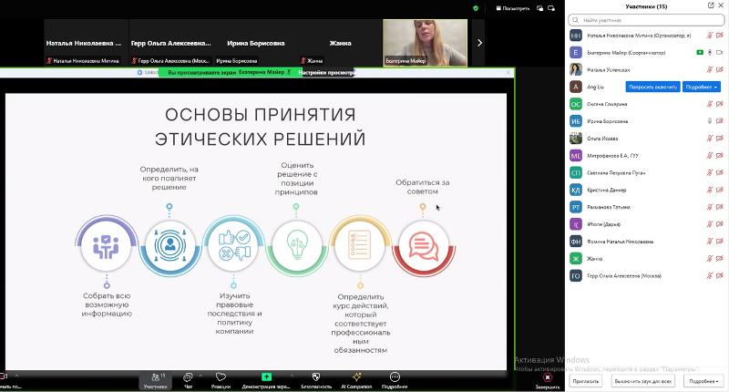 - Решение менеджерского вопроса «Бизнес или совесть?» в управлении персоналом. Трансформация этики в организациях, де-факто: расширение рамок дозволенного в условиях жёсткой конкуренции на рынках труда, товаров и услуг – тема доклада доцента кафедры управления персоналом Екатерины Майер.