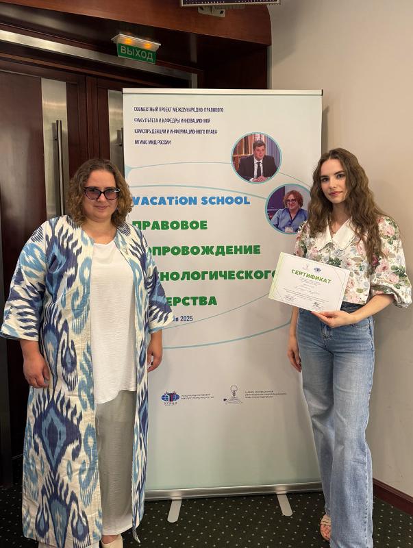 Студентка магистратуры юридического факультета ВГУ Александра Тесленко успешно прошла обучение в рамках Летней школы Московского государственного института международных отношений Vacation School «Правовое сопровождение технологического лидерства», которая была организована кафедрой инновационной юриспруденции и информационного права Международно-правового факультета МГИМО и проходила с 29 июня по 5 июля.