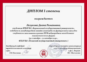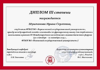 – Участие в онлайн-Олимпиаде по французскому языку в рамках III Международного молодежного лингвистического форума стало для меня чрезвычайно ценным опытом. Я горжусь тем, что смогла продемонстрировать свои знания и стать призером. Эта победа вдохновила меня на ещё более глубокое погружение во французский язык и культуру. Хочу выразить особую благодарность преподавателю кафедры французской филологии Елене Александровне Литвиновой за подготовку к участию в этом мероприятии.