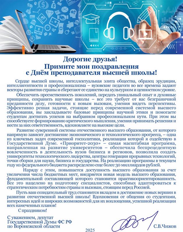 Поздравление депутата Государственной Думы ФС РФ по Воронежской области С.В. Чижова