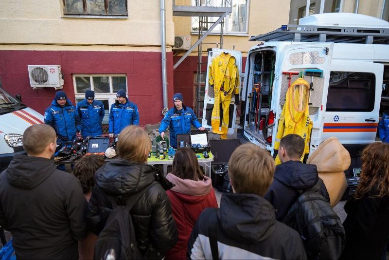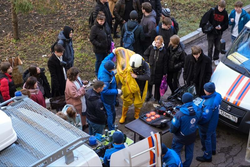 Участники мероприятия на экскурсии во внутреннем дворе университета смогли ознакомиться с оснащением аварийно-спасательных машин, в которых размещено оборудование лаборатории радиационного контроля, позволяющее оперативно реагировать на различные аварийные ситуации, в том числе – связанные с радиационным загрязнением местности. Студенты подержали в руках спектрометрическое, дозиметрическое и радиометрическое оборудование различных типов, а также примерили на себя образ спасателя, облачившись в дыхательный аппарат и костюм газоспасателя.